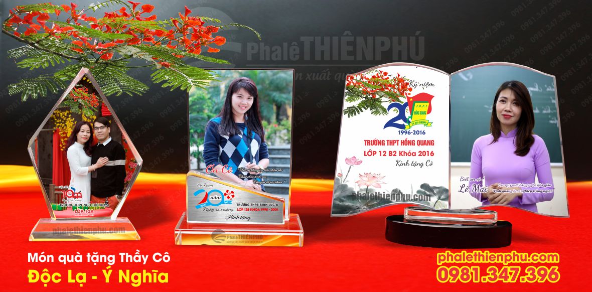 Đa số các bạn họp lớp sẽ lựa chọn món quà là những chiếc kỷ niệm chương họp lớp bằng chất liệu thủy tinh hay pha lê, lạ mắt, vừa thể hiện phong cách riêng mà không quá đắt tiền nhưng sẽ có thể trở thành món quà tặng lưu giữ kỷ niệm. Xu thế in những hình ảnh về trường lớp, hoa phượng, hình ảnh thầy cô, bạn bè lên những tấm thủy tinh pha lê làm quà tặng ngày họp lớp vừa thiết kế lạ đẹp mắt, vừa lưu giữ thật lâu mà không sợ bị hoen ố hay phai nhạt. Còn gì tuyệt vời hơn khi kí ức thời học trò khoảng thời gian hồn nhiên vui tươi chứa đầy ắp những kỉ niệm khó quên.được lưu giữ lại trên những chiếc kỷ niệm chương họp lớp như thế này.